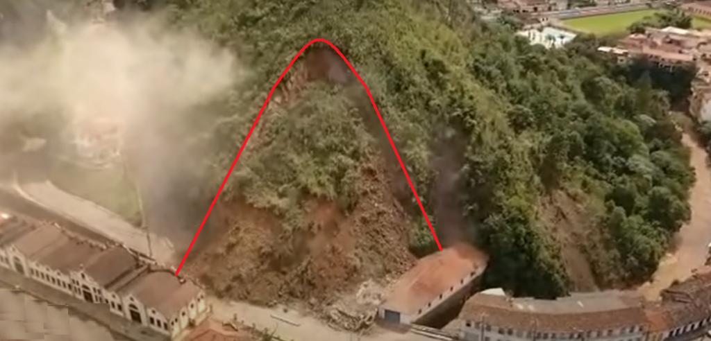 Cena de vídeo do deslizamento cilíndrico/circular de talude no Morro da Forca em Ouro Preto – MG, com a linha vermelha demarcando a linha aproximada de descontinuidade do maciço. (Fonte: vídeo publicado na Internet pelo Jornal O tempo em 13/01/2022